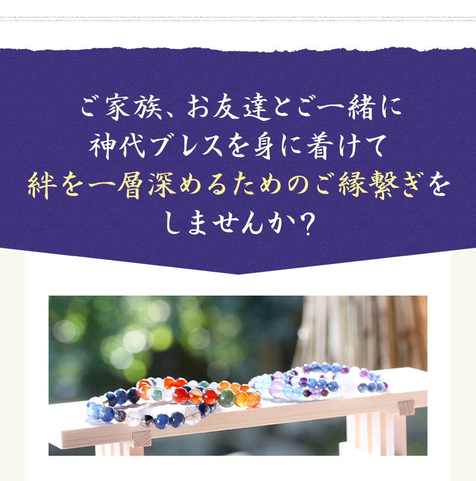 今までたくさんの神代ブレスをお作りしてきた中で、ご家族で一緒に身に着けられたお客様から、「家庭内が明るくなり、会話も笑顔も増えた。」とのお声をいただきました。